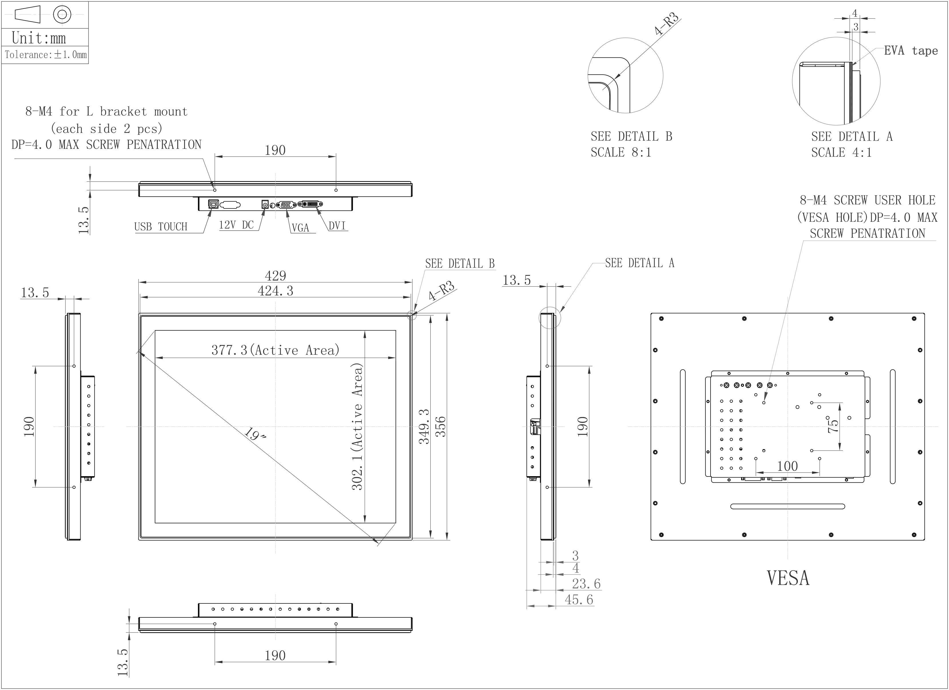 Mounting Type | Standard:VESA 75mm and 100mm Optional:Mount bracket, horizontal or vertical mount | |