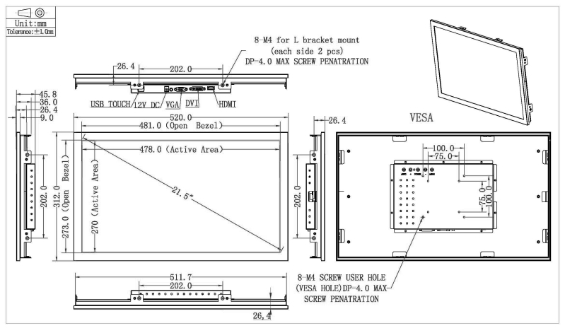 Monitor Dimensions (W*H*D) | 520*312*45.8(mm) | |